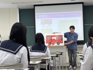 テーマは「絵本」に関する内容で、乳児向けの絵本が小さい理由などを生徒さんと一緒に考えました。