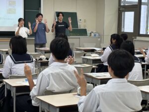 最初は少し緊張していた高校生の皆さんも、手遊びを通して笑顔に。