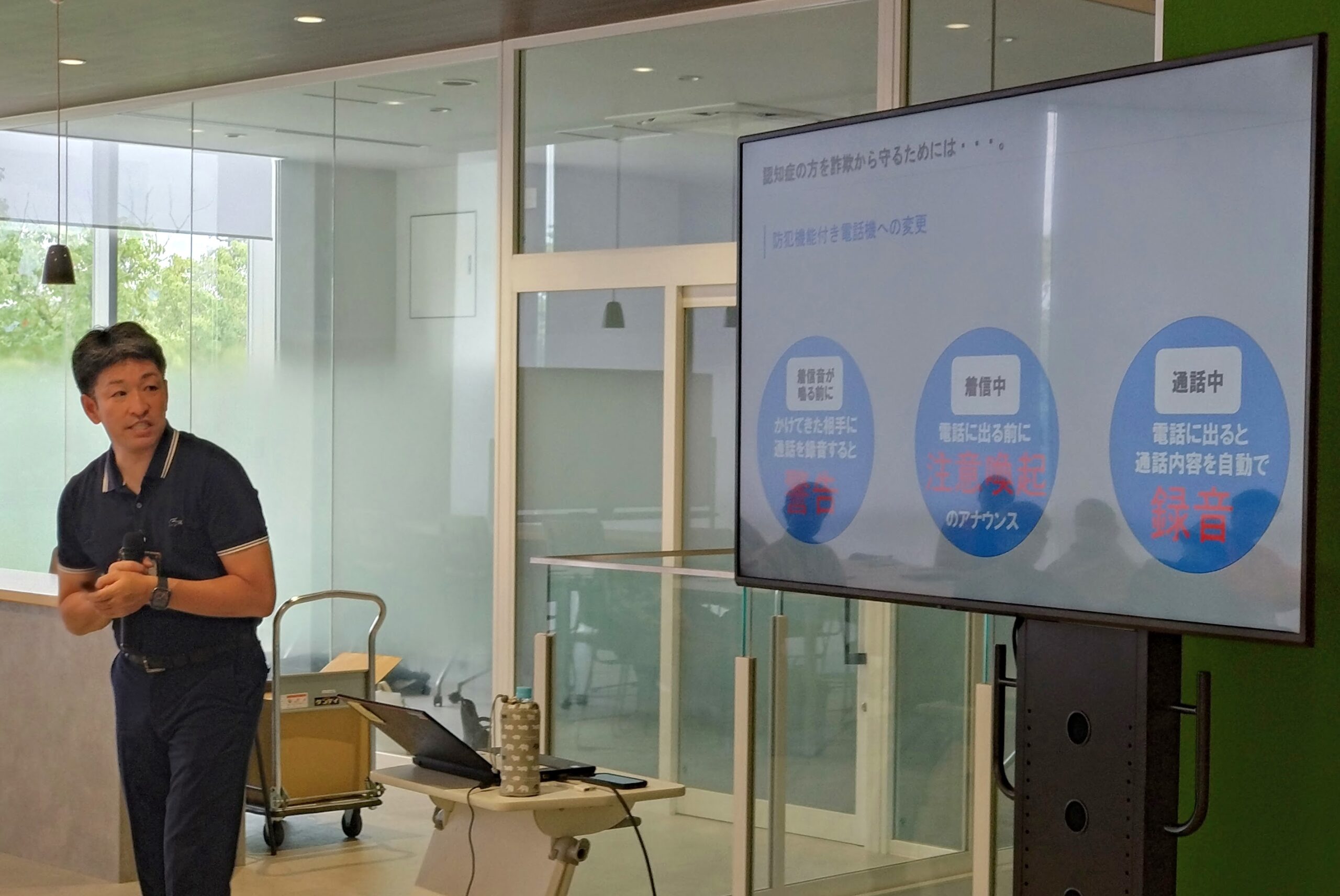 認知症のある人を特殊詐欺から守るための手段として、電話をかけてきた相手に通話を録音すると警告したり、通話中は通話内容を自動で録音したりする「防犯機能付き電話機への変更」など、具体例を示して話をしていただきました。