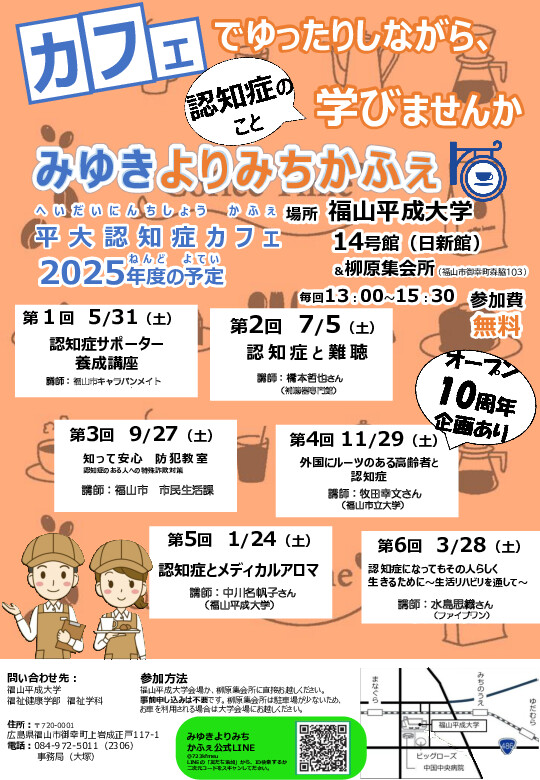 当日は、平大認知症カフェ(みゆきよりみちかふぇ)が10年目に入る記念の行事となります。午前中、本学をスタートとゴールにする、「御幸町スタンプラリー」にも参加できます。皆さんのご参加をお待ちしております。