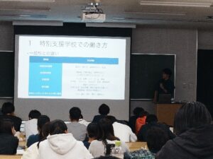 スポーツ企業情報演習で卒業生による講話の第2回目が10月22日(水)に行われ、青木勇人さん(健スポ10期生:沼隈特別支援学校教諭)にご登壇いただきました。