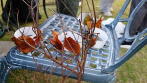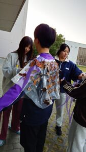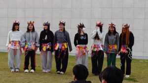 秋の実や落ち葉など、学生が地域の公園や神社へ出かけ集めてきたものを使って衣装やアクセサリーを作って着飾りました。