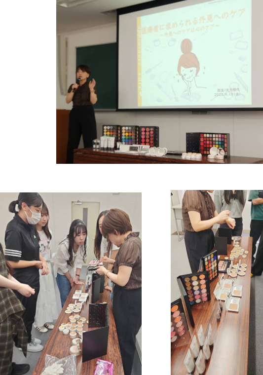 学生からは、「講義では普段私たちの身近にあるメイクとは異なった看護職としての視点からの外見へのケアについて学びました!」「外見へのケアは単に美しく見せるためのケアではなく、その人がその人らしく生きていくための「こころのケア」です。