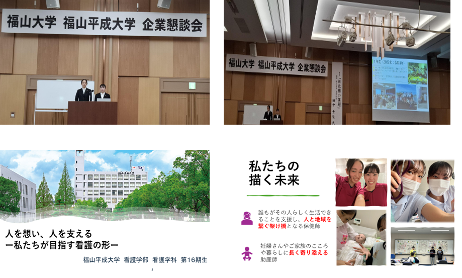 昨年度に引き続き、福山平成大学学生代表として看護学科4年生2名が「人を想い、人を支える -私たちが目指す看護のかたち―」のテーマで発表を行いました。コロナ禍の中、入学し、4年間での学び、将来の自分についてスライドを作成し発表しました。
