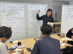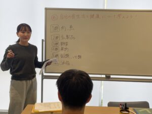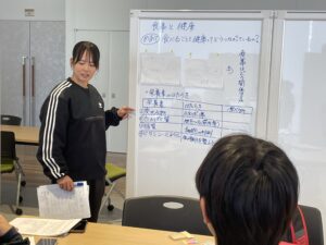 健康スポーツ科学科教員の柴山 慧准教授が担当する保健体育科教育法Ⅲでは、学生たちが保健の模擬授業に挑戦しています。学習指導要領の理解、教材研究、指導案の作成などをもとに、各自が模擬授業を行い、その内容について、担当教員や生徒役からフィードバックをもらって、それを次の実践に活かしています。