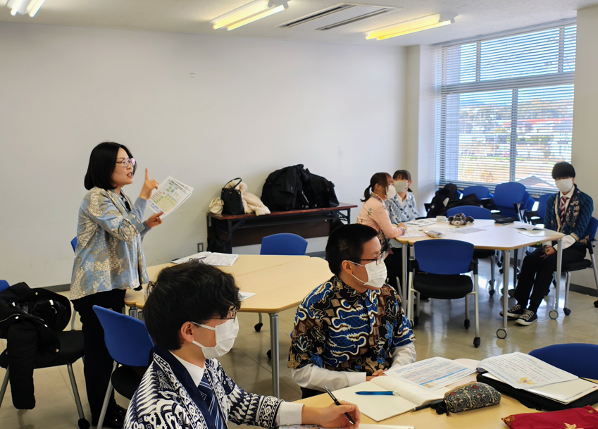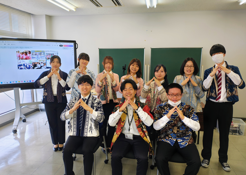 11月20日(木)キャレオスホールディングス株式会社の竹林 剛様(Zoom参加)、松井 亨介様をゲストスピーカーとしてお招きし、インドネシアの福祉とフジアカデミーの取組について学びました。講義の前に、インドネシアの民族衣装であるバディックを紹介していただき全員で着用し受講しました。
