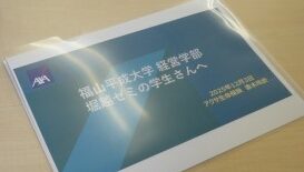 3年生が受講するゼミナールⅠの堀越ゼミで12月3日、経営学部経営学科OBの斎木玲於さん(2022卒、アクサ生命保険(株)勤務)によるゲストスピーチがありました。堀越ゼミでは毎年、地元企業の社長やOB(OG)との交流を通じて、これから社会に出るゼミ生一人ひとりがキャリアを考える機会を提供しています。