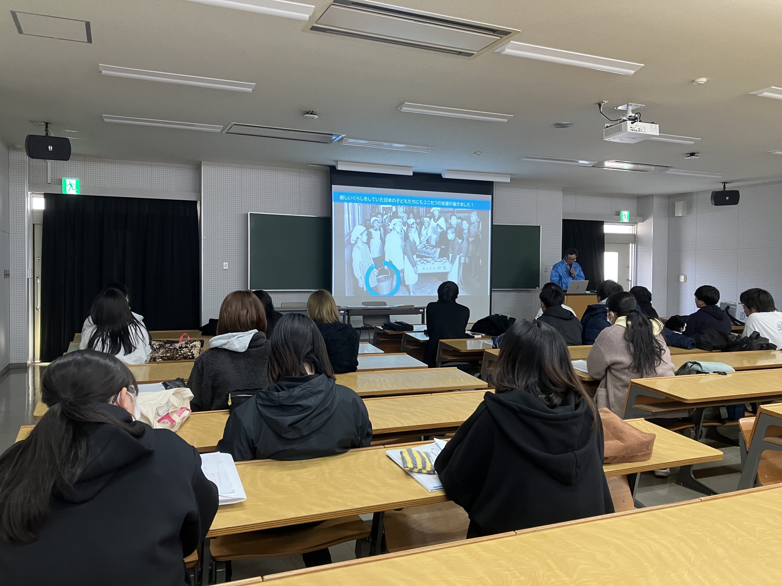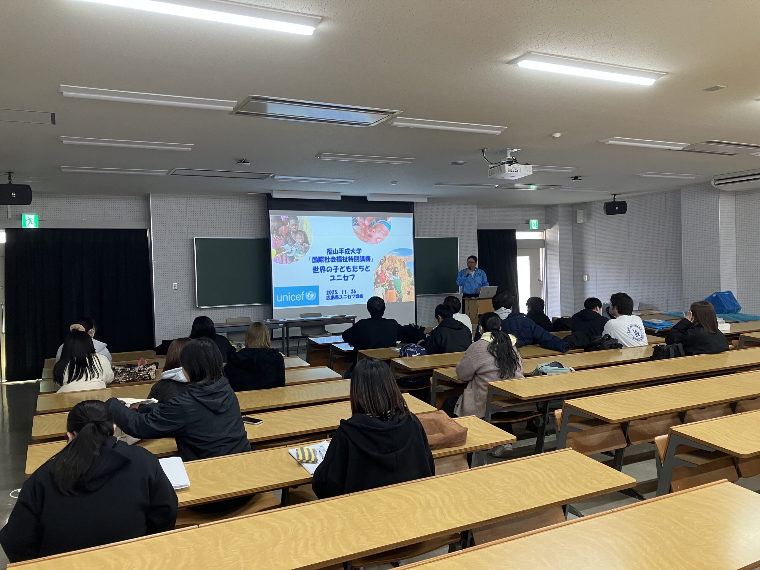 「国際社会福祉特講」の授業では世界の国々の社会福祉について学んでおりますが、今回は広島県ユニセフ協会に出前授業を依頼し、同協会の事務局長福島守様から「難民問題」についてご講演頂きました。