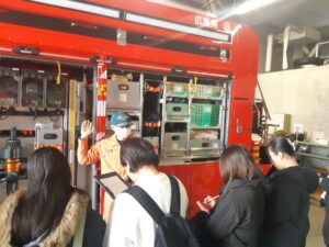 こども学科の2年生が、小学校教員を目指す学びの一環として、消防署へうかがい、「安全」「連携」「防災」「緊急対応」「地域連携」などについて学びました。