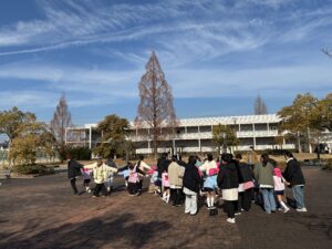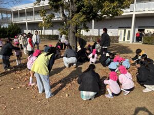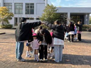 12月19日にいちご幼稚園の5歳児さんと一緒に大学キャンバスで落ち葉を拾って遊びました。