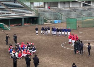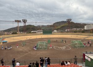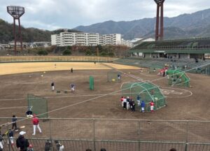 福山市スポーツ協会主催の「広島東洋カープ現役選手による野球教室」が、12月21日(日)にエブリイ福山市民球場で開催されました。この野球教室に本学の野球部員が、運営協力員グラウンドスタッフとして携わりました。現役カープ選手4名による小学6年生を対象とした教室で、シートノックなどのサポートや、バッティングでのサポートに関わりました。