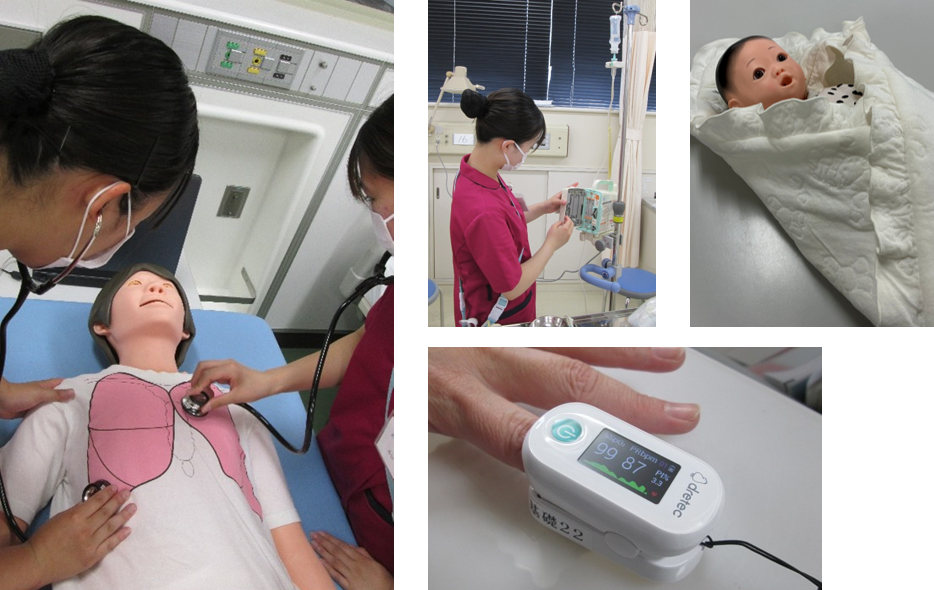 看護学科のスタンプラリーでは、各演習室で「赤ちゃん人形の抱っこ」「フィジカルアセスメント人形の呼吸音聴診」「輸液ポンプ等の医療機器の取り扱い」が体験できます。