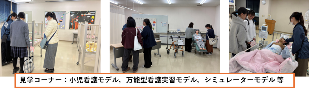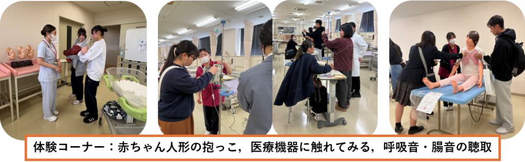 来場者の皆さまには、1階から4階までの実習室を自由に巡っていただき、看護技術の見学や体験を通して学びのイメージをより深めていただきました。教員や学生スタッフが寄り添いながらサポートし、皆さまに楽しく参加していただける時間となりました。「説明がとてもわかりやすく、楽しかったです」などの声が寄せられました。