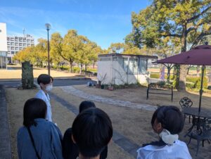 キャンパスツアーでは、天候にも恵まれ、こども学科棟の庭や学内施設を学生が案内しました。