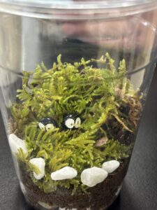 小さなコップの世界に苔や石を配置し、それぞれ個性のあるかわいい苔テラリウムが完成しました。