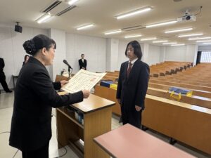 スポーツ健康科学研究科(大学院)の学位記配付行事を行いました。永井純子研究科長からの祝辞のあと、岡本和浩さんが修士の学位記授与を受けました。