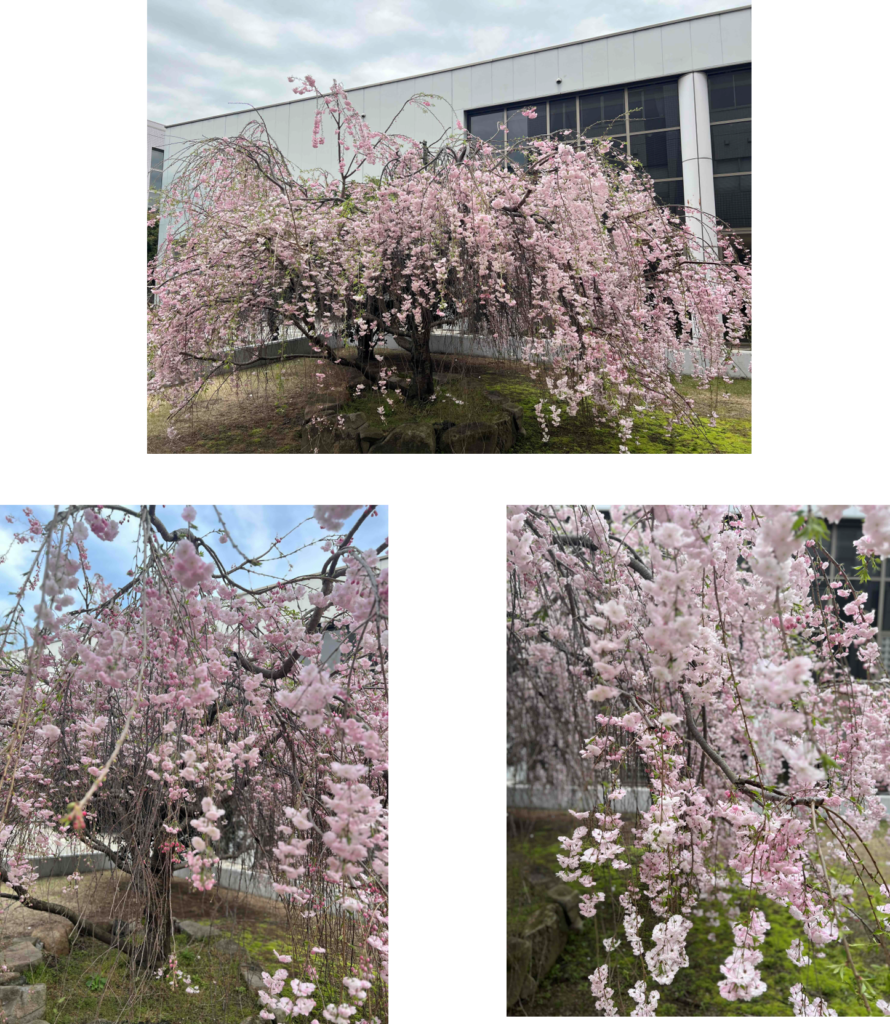 現在、看護学部棟の前では、枝垂れ桜が満開を迎えています。「一樹の陰一河の流れも他生の縁