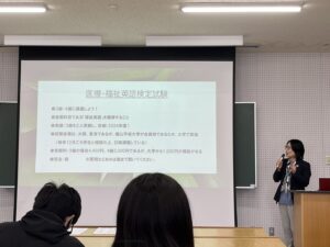2年生オリエンテーションは、新学科長である奥田先生の挨拶からスタートしました。続いて教員紹介が行われ、学生たちは学びを支える学科教員の顔ぶれを知る機会となりました。その後は、国家試験対策や学科推奨資格、就職ガイダンス、履修に関する説明が行われ、2年生での学びや進路に向けた具体的な情報が共有されました。