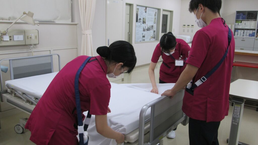 次回からの本格的な演習に向けて、ベッドメーキングを行いました。