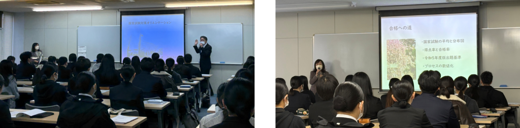 看護師国家試験対策オリエンテーションは、国家試験に向けた学習の進め方や対策について理解を深め、合格に向けて主体的に取り組む意識を高めることを目的としています。