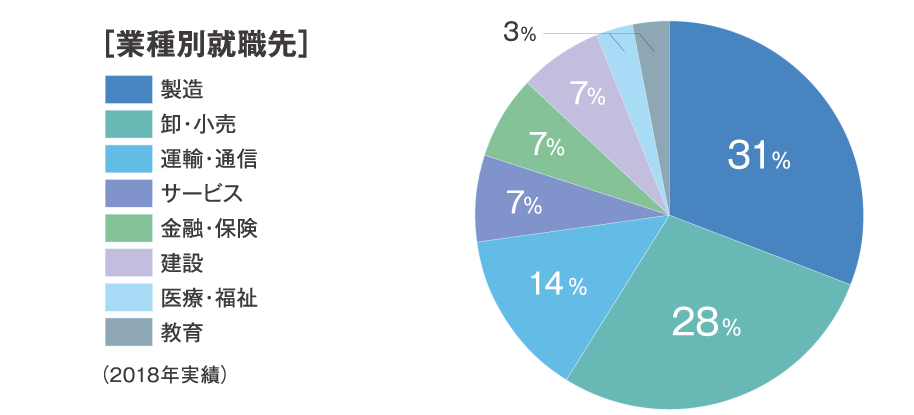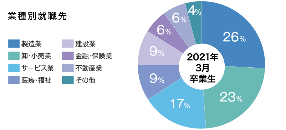 業種・職種ともに進路は多様です。業種では、卸・小売業、製造業、サービス業が中心です。