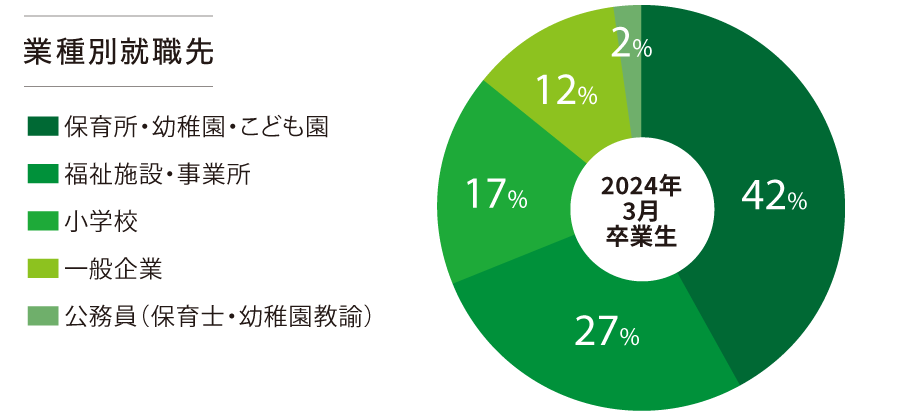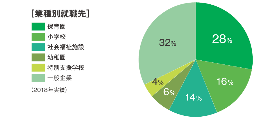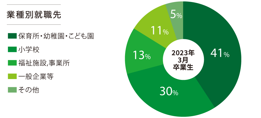 資格を取得し、保育所、幼稚園、小学校などへの就職を目指します。また保育士資格を活かし、児童養護施設などの福祉施設へ就職もできます。一人ひとりの可能性を伸ばす、多様な選択が可能です。