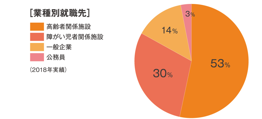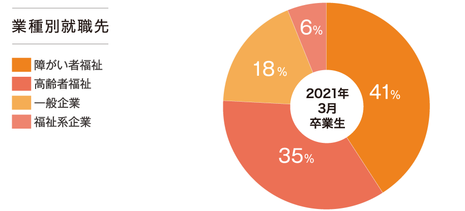 高齢者、障害者の介護や自立支援に関する業務が中心ですが、児童分野や病院のソーシャルワーカーのほかに、近年は一般企業を目指す学生も増えています。希望に応じた多様な進路を目指せます。