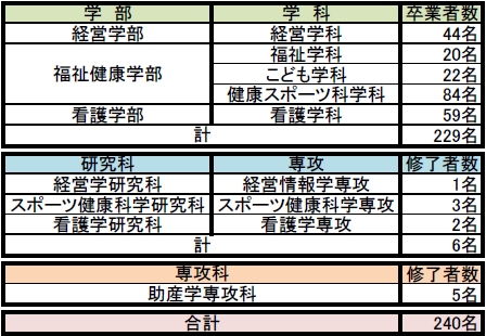 なお、今年度の卒業者数および修了者数は下表の通りでした。