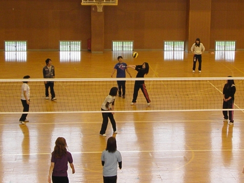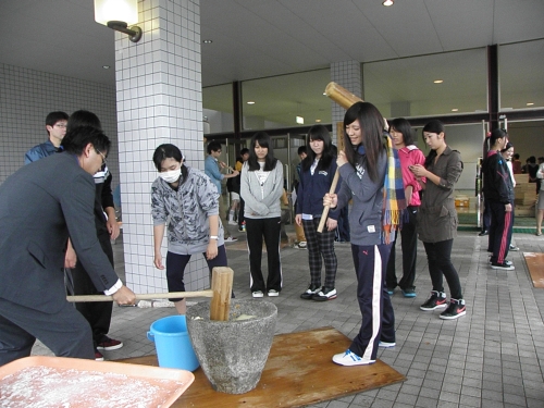 球技大会は第1体育館でバレーボールを、7号館では餅つきを行っています。