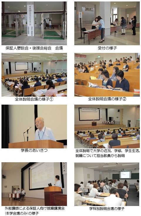 福山平成大学では,保証人の皆さまと大学との連携を深め,学修,学生生活及び就職支援の充実を図ることを目的として,「保証人懇談会」を毎年8月下旬~9月上旬に開催しております。