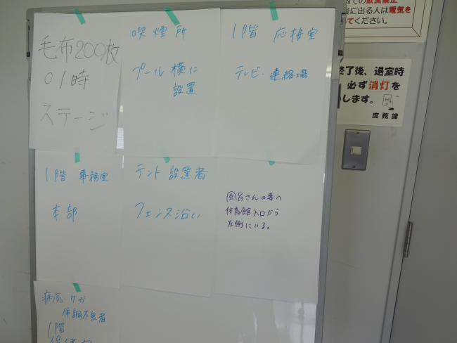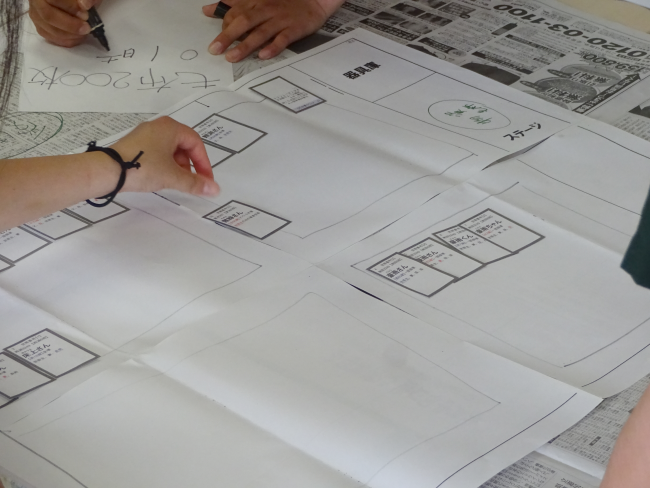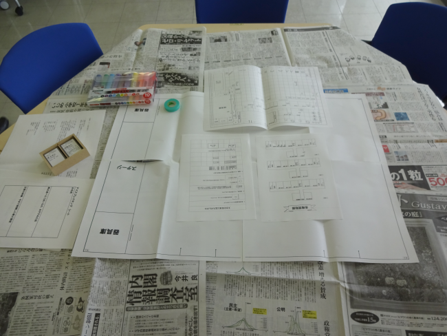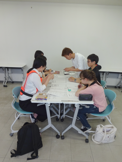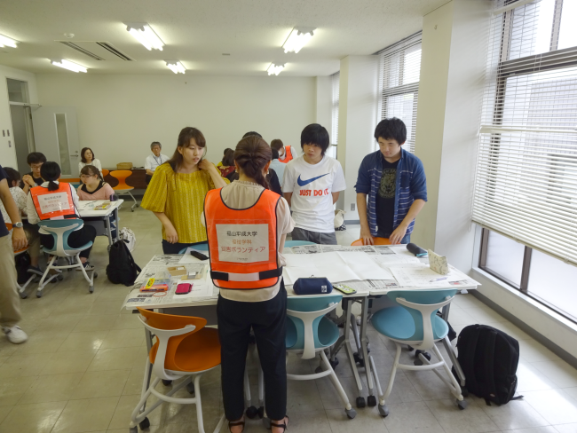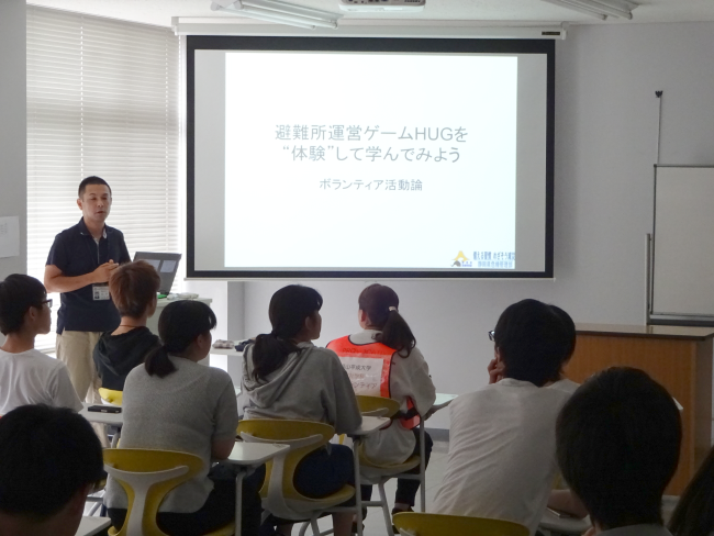 FD推進委員会では、毎年、教員研修の一環として授業公開を行っていますが、今年度は、福祉学科の「ボランティア活動論」(杉本浩章准教授・崔銀珠講師)の授業公開を6月21日(金)3-4限に行いました。今回の授業は、避難所運営をゲーム形式で模擬体験できるHUG(Hinanjyo Unei Game)というツールを使って行われました。これは、小学校をモデルにした避難所の図面を使用して、まずファシリテータ(学生)が名前と本人情報が記された小さなカードを読み上げ、それを基にそれらの人々(カード)を混乱なく、いかに配置するかを考えていくゲームです。5~6名のグループに分かれて、避難場所となる小学校の体育館や教室、校庭の図面に「受付」や居住スペースの配置などを書き込んでから、避難してきた人々(カード)をグループで決めた条件に従って、図面上に置いていきます。カードは避難所で一人分のスペースとして必要な大きさの縮小サイズになっています。当日の時間帯(午後4時~11時)、気温(日中27度、夜間20度)、ライフラインはすべてなし、などの細かな設定がなされています。また、カードの中には、給水がいつから始まるなどの情報も入っており、それらの情報の掲示も行います。学生たちはグループ内で、トイレをどうするか、高齢者、障害者、持病のある人々がいかに快適に過ごせるか、テント持参の人の場所確保、さらには駐車場の配置、などさまざまな課題を解決しながら、100名の人々を受け入れていくというゲームです。先生方が各グループを回り、的確な質問で学生たちが気づいていない課題についてヒントを与えたり、解決策のアドバイスを与えながら授業が展開されました。