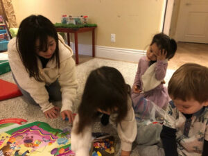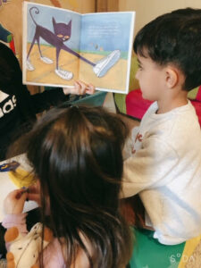 園児に本の読み聞かせをしている様子や一緒に遊んでいるところです。