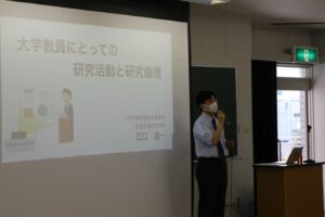 大学教員にとっての研究の意義や目的、そしてその研究方法と教員にとって身近な話題から始まり、時にご自身の経験を交えながら、研究倫理の歴史的背景などについて詳しくお話しいただきました。