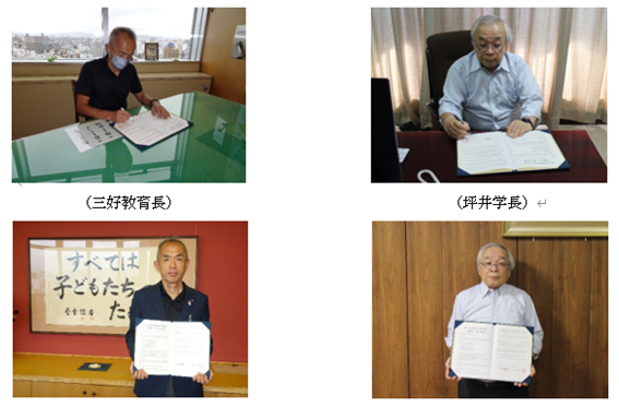 三好雅章教育長と坪井始学長が、それぞれの協定書に署名・押印し、連携・協力に関する協定を締結いたしました。
