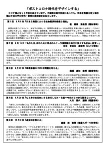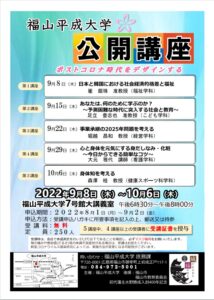 令和4年度福山平成大学公開講座を,令和4年9月8日(木)~10月6日(木)の毎週木曜日に開講します。今年度は,「ポストコロナ時代をデザインする」がテーマです。