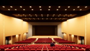 入学式や卒業式などの式典を行える講堂、1階には学生の憩いの場所