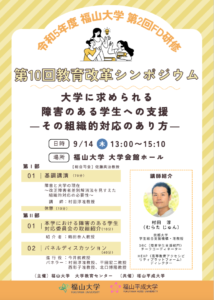 最初に、京都大学学生総合支援機構の村田淳先生による「障害と大学の現在~改正障害差別解消法を見すえた組織的対応の必要性~」という演題で基調講演がなされ、続いて、福山大学の先生方によるパネルディスカッションが行われました。障害を持つ学生をどのように教育的な配慮を行っていくことが必要なのかについて、具体例を挙げて詳しく話され、また、パネルディスカッションでは、福山大学での取り組み例が紹介されました。