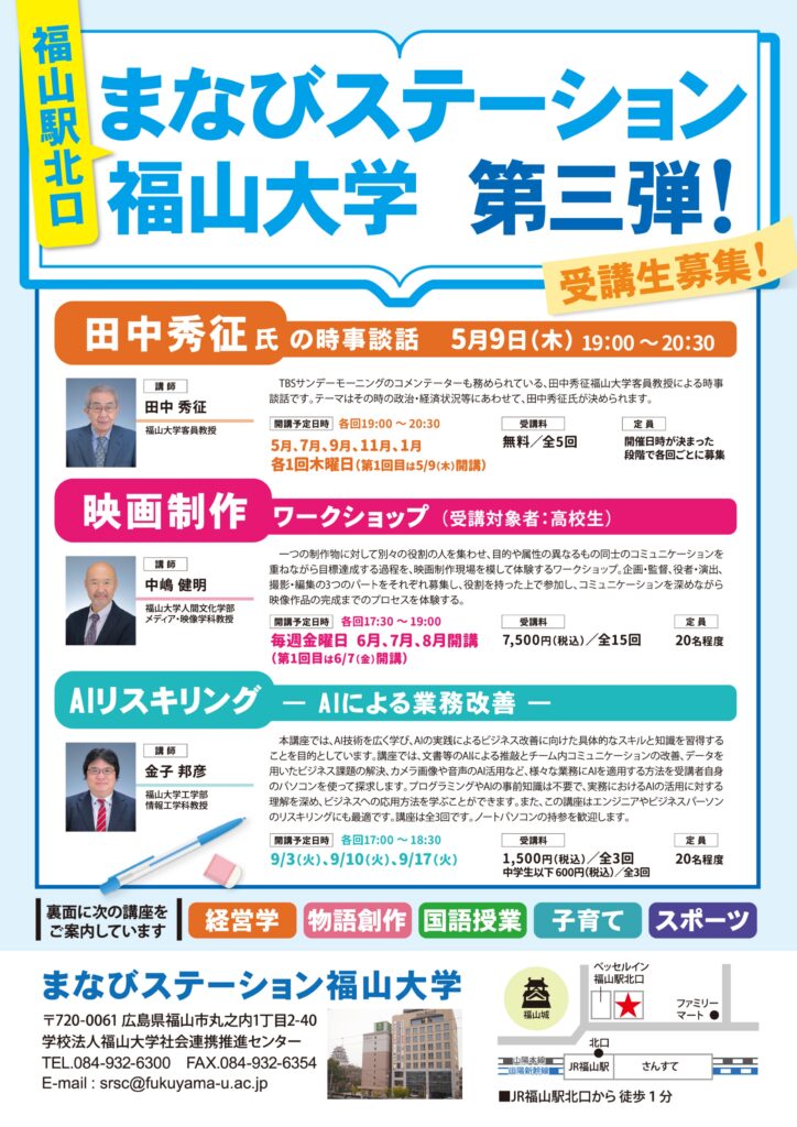 令和6(2024)年4月より、学校法人福山大学が、福山駅前(北口)の学校法人福山大学社会連携推進センターにて、一般市民のみなさまを対象とする生涯学習支援およびリスキリングのための講座(まなびステーション福山大学(略して、まなステ))を開講しました。
