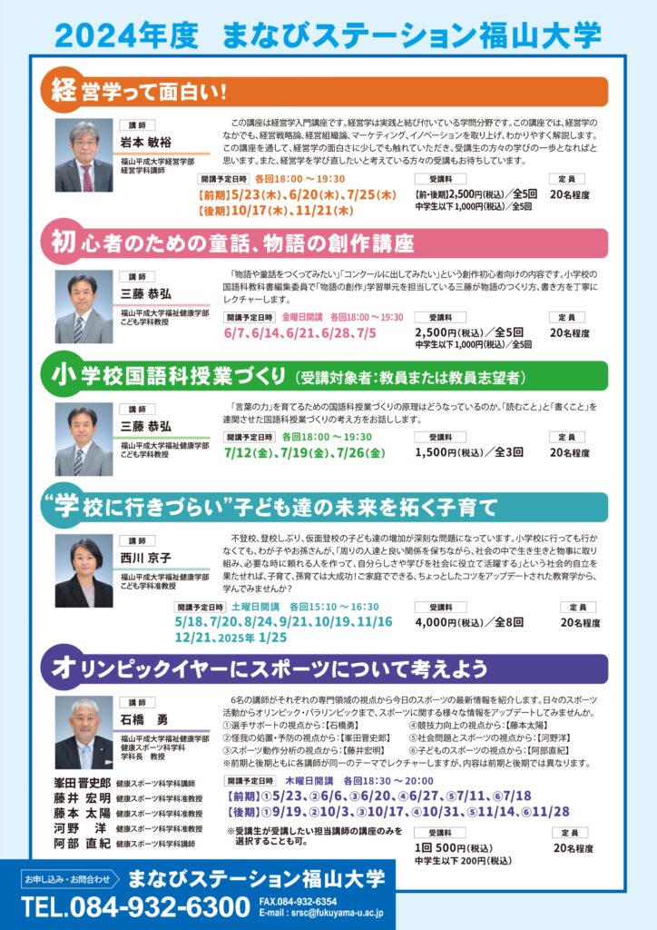 福山平成大学の教員も講師としてまなステでレクチャーします。(チラシ第3弾裏面参照)。