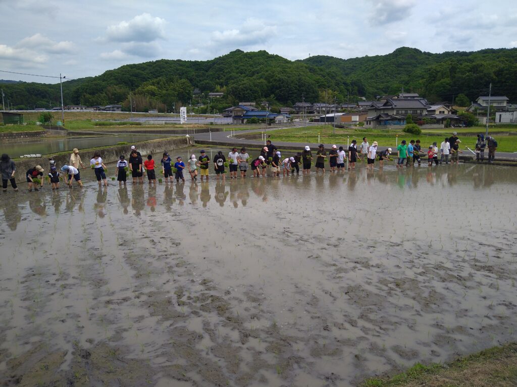 今回は、地域の子供育成会からも参加があり、約10名の子供たちも一緒に田植えをしました。