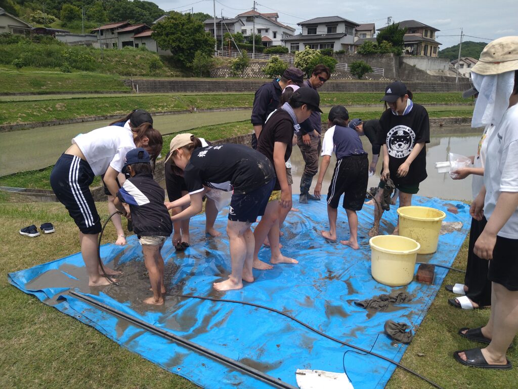 留学生を含む学生たちも子供たちとの交流を楽しみながらと一緒になって田植えを体験できうれしそうでした。
