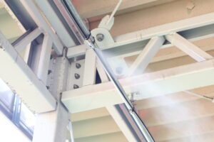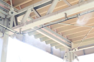 ミストシャワーは、細かく霧状にした水を空気中に散布することで、周囲の温度を