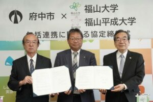 福山平成大学は府中市と包括連携協定を締結することとなり、福山大学と共に令和7(2025)年8月25日(月)に府中市役所において合同で締結式を行いました。
